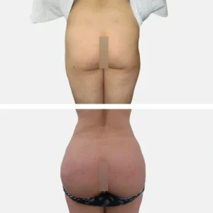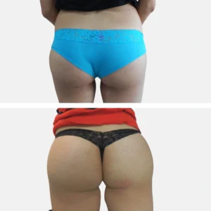 For buttock augmentation with fat transfer, there are only small puncture marks. In the case of silicone implants, there is a small hidden incision between the buttocks. A compression garment must be worn for 3 weeks in both cases.